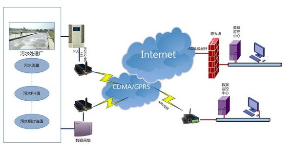 2、污水處理監(jiān)測(cè)點(diǎn)利用各種傳感器或?qū)S脙x表,采集與污水處理有關(guān)的物理,化學(xué)參數(shù)。如污水處理設(shè)備運(yùn)行狀況,工業(yè)用水排放污水流量,污水PH值,污水的相對(duì)濁度等。各種數(shù)據(jù)從監(jiān)測(cè)儀的通信口傳送到4G LTE DTU,由4G LTE DTU把數(shù)據(jù)打成TCP/IP 包,發(fā)送到4G LTE DTU中設(shè)定的具有固定IP地址或者域名的監(jiān)控中心站數(shù)據(jù)中心服務(wù)器端口上。
